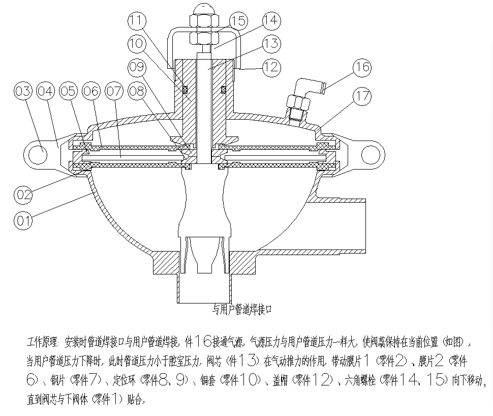 限流卫生级恒压阀工作原理:安装时管道焊接口与用户管道焊接,件16接通气源,气源压力与用户管道压力一样大,使阀蕊保持在当前位置(如图),当用户管道压力下降时,此时管道压力小于腔室压力,阀芯(件13)在气动推力的作用,带动膜片1(零件2)、膜片2(零件6)、钢片(零件7)、定位环(零件8、9)、铜套(零件10)、盖帽(零件12)、六角螺栓(零件14、15)向下移动,直到阀芯与下阀体(零件1)贴合。
